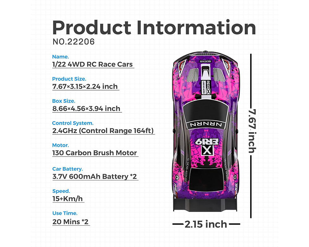 Модель изготовлена из прочных материалов ABS и PP, имеет ударопрочный PVC-кузов с повышенной стойкостью к падениям и столкновениям. Габариты автомобиля составляют 19,5%. 8 × 5,7 см, что обеспечивает удобство управления даже в ограниченном пространстве. Доступные цвета — синий и фиолетовый.