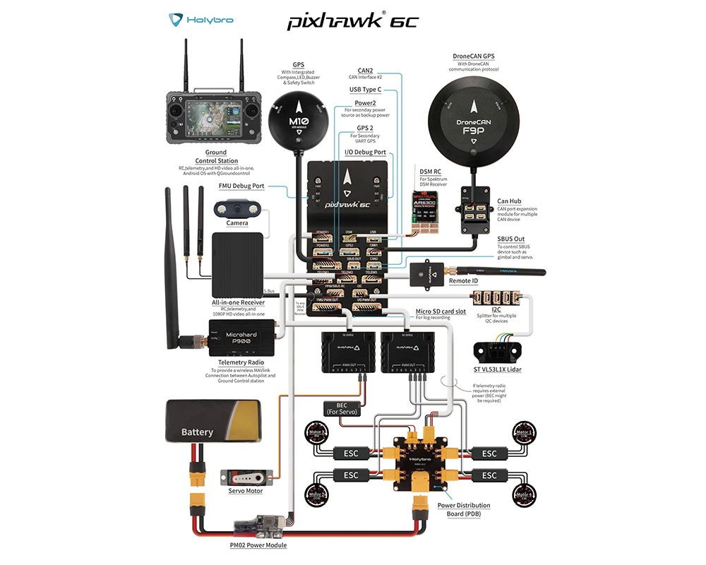 Pixhawk 6C — это обновленное поколение популярной линейки полетных контроллеров Pixhawk, созданное в соответствии с открытыми стандартами Pixhawk FMUv6C и Connector Standard. Контроллер поставляется с предварительно установленной прошивкой PX4. В основе устройства — микроконтроллер STM32H743 от STMicroelectronics дополнен сенсорами Bosch и InvenSense, что обеспечивает высокую гибкость и стабильность управления автономными платформами. Решение подходит как для учебных и научных проектов, так и для коммерческого применения.