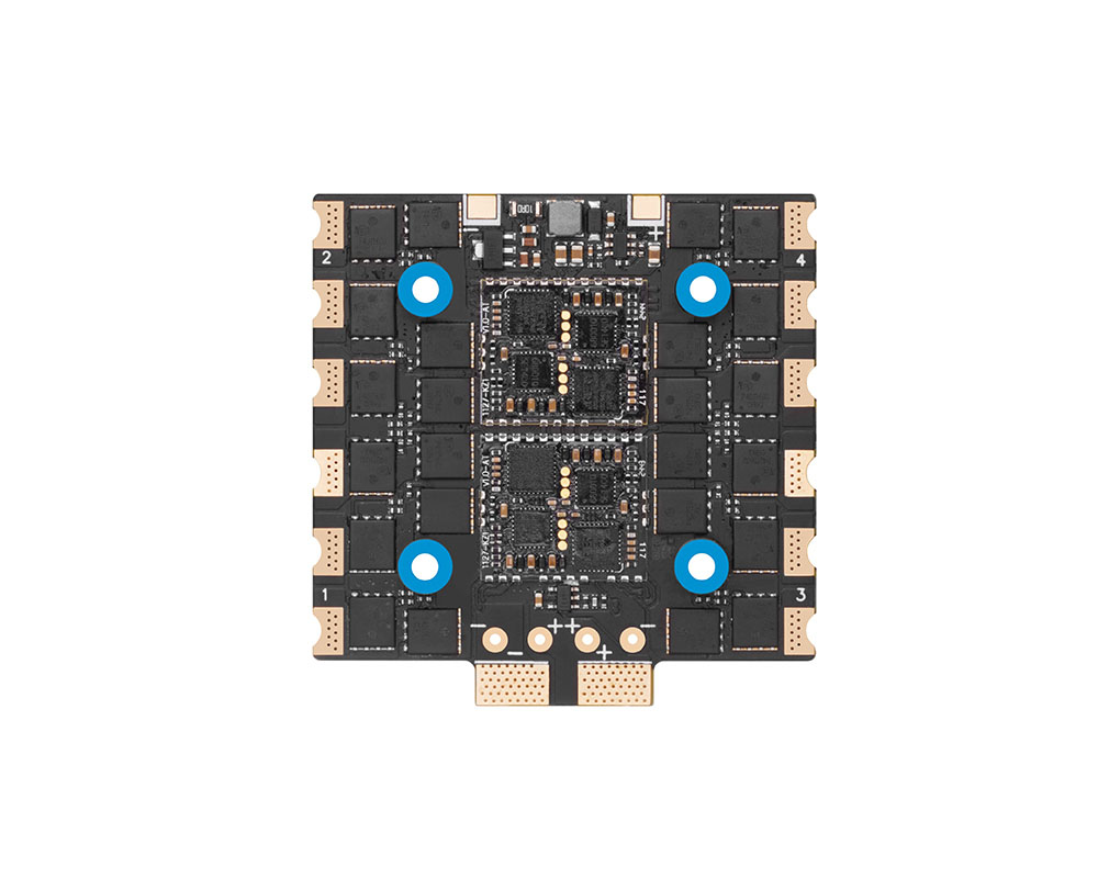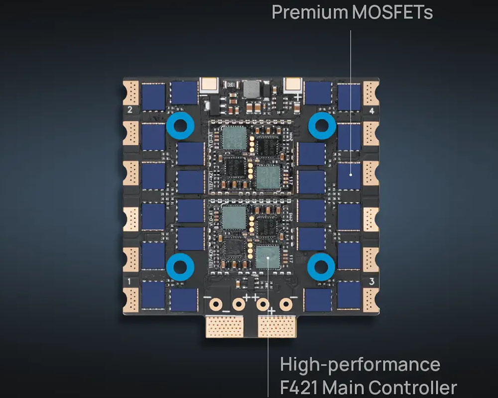 Регулятор построен на высокопроизводительном контроллере F421 и оснащен качественными MOSFET-транзисторами, обеспечивающими стабильное управление двигателями даже при высоких нагрузках. Поддержка двунаправленного DShot и RPM-фильтра помогает снизить нагрев моторов, повысить стабильность полета и эффективность работы силовой системы. Компактный форм-фактор и стандартный крепеж позволяют легко интегрировать ESC в большинство рам для FPV-дронов класса 13-18 дюймов.