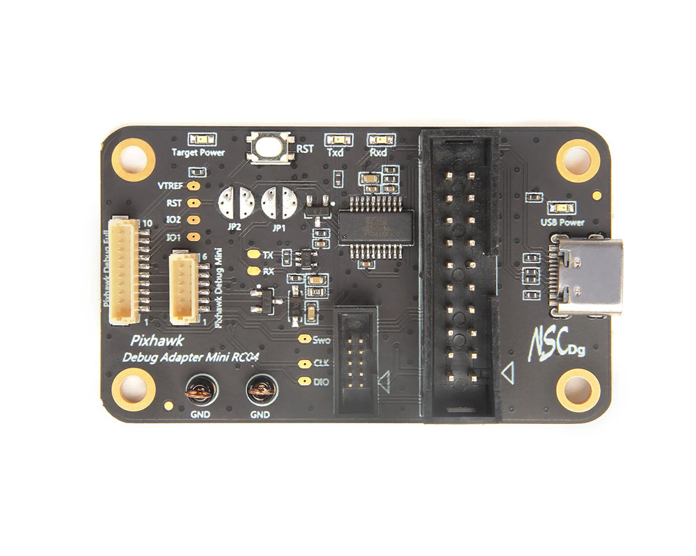 Pixhawk Debug Adapter забезпечує інтерфейси JTAG SWD та Serial для налагодження апаратного забезпечення, сумісного з Pixhawk. Підтримуються обидва стандарти відлагоджувальних роз’ємів Pixhawk: цільовий 6-контактний (FMUV5) і цільовий 10-контактний (FMUVxX).