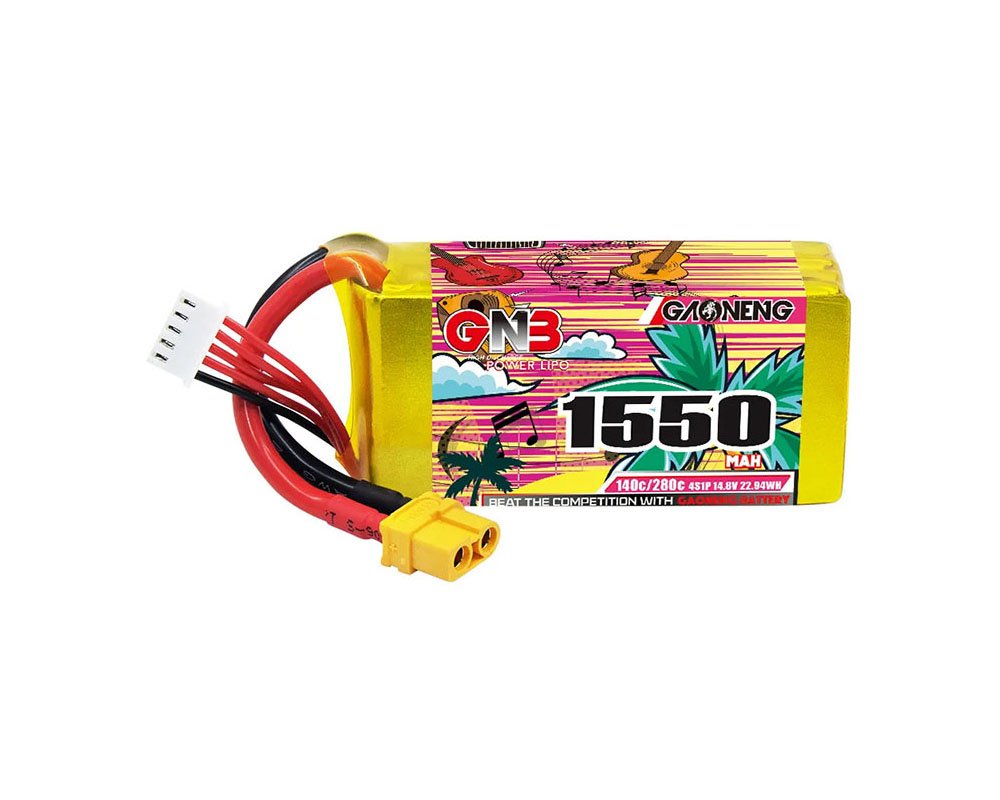 Акумулятор GNB 14.8V 1550mAh 140C 4S1P XT60U — це потужний LiPo-пак для FPV-дронів 5–6", що забезпечує стабільну напругу та високий струм розряду. Підходить для фрістайлу та гонок, демонструє мінімальні просадки під навантаженням і підтримує швидку зарядку до 5C. Оптимальний баланс між ємністю та вагою.