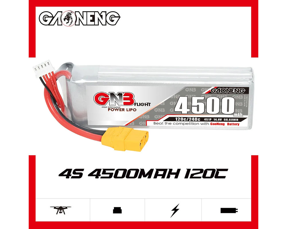 Акумулятор GNB 14.8V 4500mAh 120C Li-Po 4S1P XT90 — ємний LiPo-пак для потужних FPV-дронів 7" і великогабаритних RC-моделей. Забезпечує стабільну напругу та високий струм розряду без значних просадок під навантаженням. Підходить для тривалих польотів і важких сетапів, підтримує заряд до 5C.