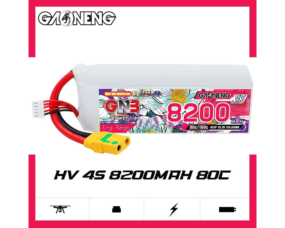 Акумулятор GNB 15.2V 8200mAh 80C 4S1P HV XT90H — ємний LiHV-пак для великогабаритних FPV-дронів, авто та іншої RC-техніки. Забезпечує стабільну напругу 15.2V та високу струмовіддачу, що важливо для тривалих польотів і навантажених сетапів. Підтримує швидку зарядку до 5C і оснащений силовим роз’ємом XT90 для надійного підключення.