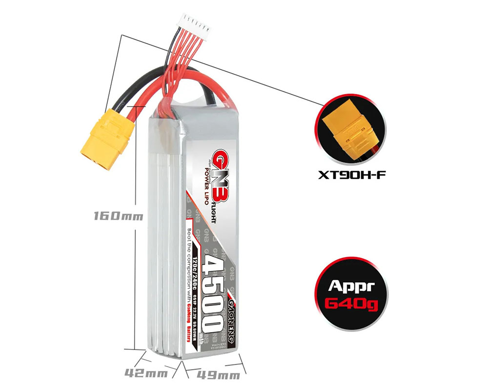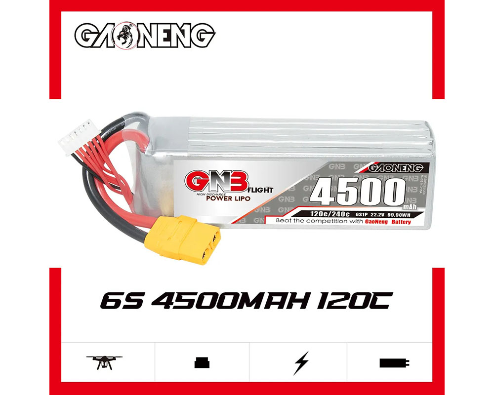 Акумулятор GNB 22.2V 4500mAh 120C Li-Po 6S1P XT90 — потужний LiPo-пак для великих FPV-дронів (7"+), cine-lifter платформ та RC-моделей. Забезпечує стабільну напругу і високий струм розряду навіть під значним навантаженням. Підходить для тривалих польотів і важких сетапів, підтримує швидку зарядку до 5C.