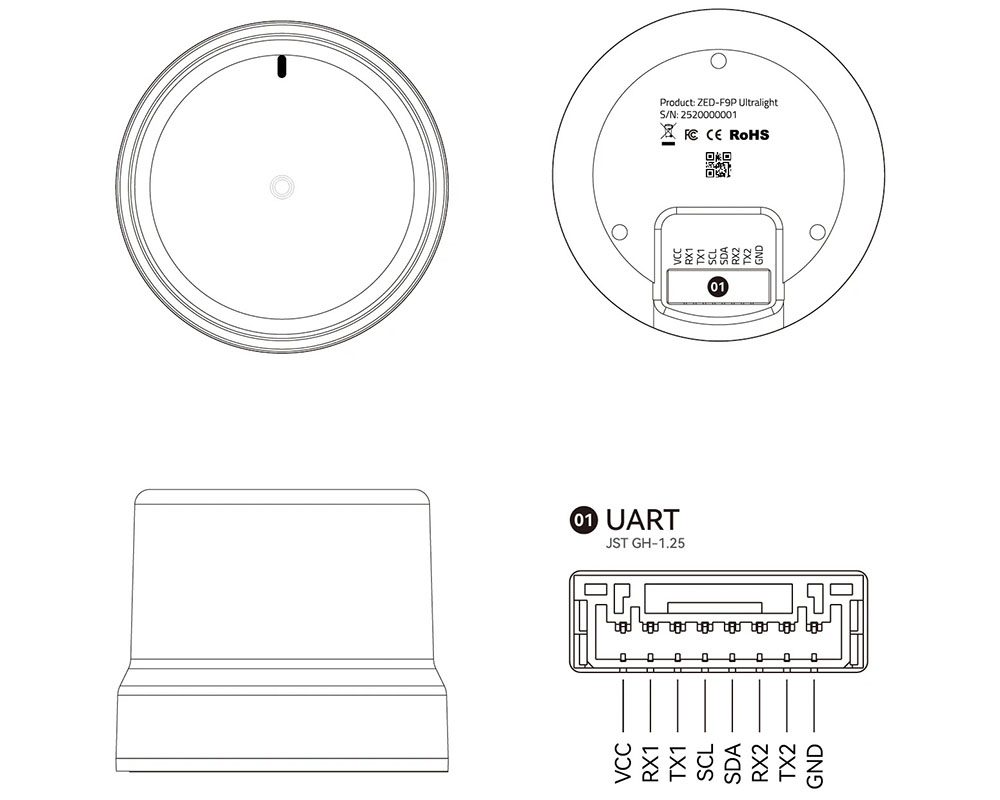 Holybro H-RTK ZED-F9P Ultralight — ультралегкий RTK-GNSS модуль, розроблений для систем, у яких маса обладнання має вирішальне значення без компромісів у точності навігації. Пристрій використовує приймач u-blox ZED-F9P, оснащений вбудованою гелічною антеною та компасом IST8310.