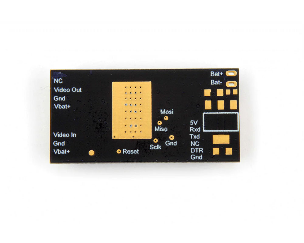 Модуль оснащений роз’ємами GHR, має паяльну перемичку для вибору стандарту PAL, а також виведені тестові точки HSYNC і LOS для діагностики та налаштування. Завдяки мінімальним габаритам і малій вазі підходить для компактних FPV-збірок.