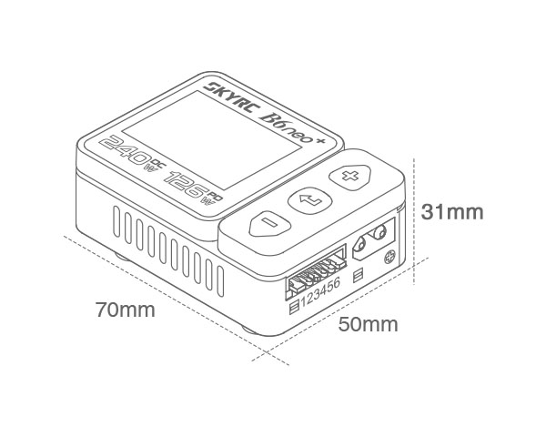 Нове покоління зарядного пристрою — B6neo+ — поєднує в собі компактність, потужність та інтелектуальні функції, створені для RC-ентузіастів. Корпус виконано з пластика PC-ABS V0 (вогнестійкий клас) з розмірами лише 70×50×31 мм і вагою 82 г.